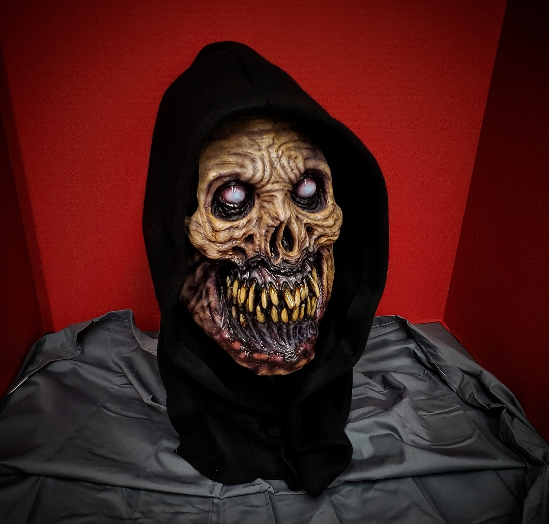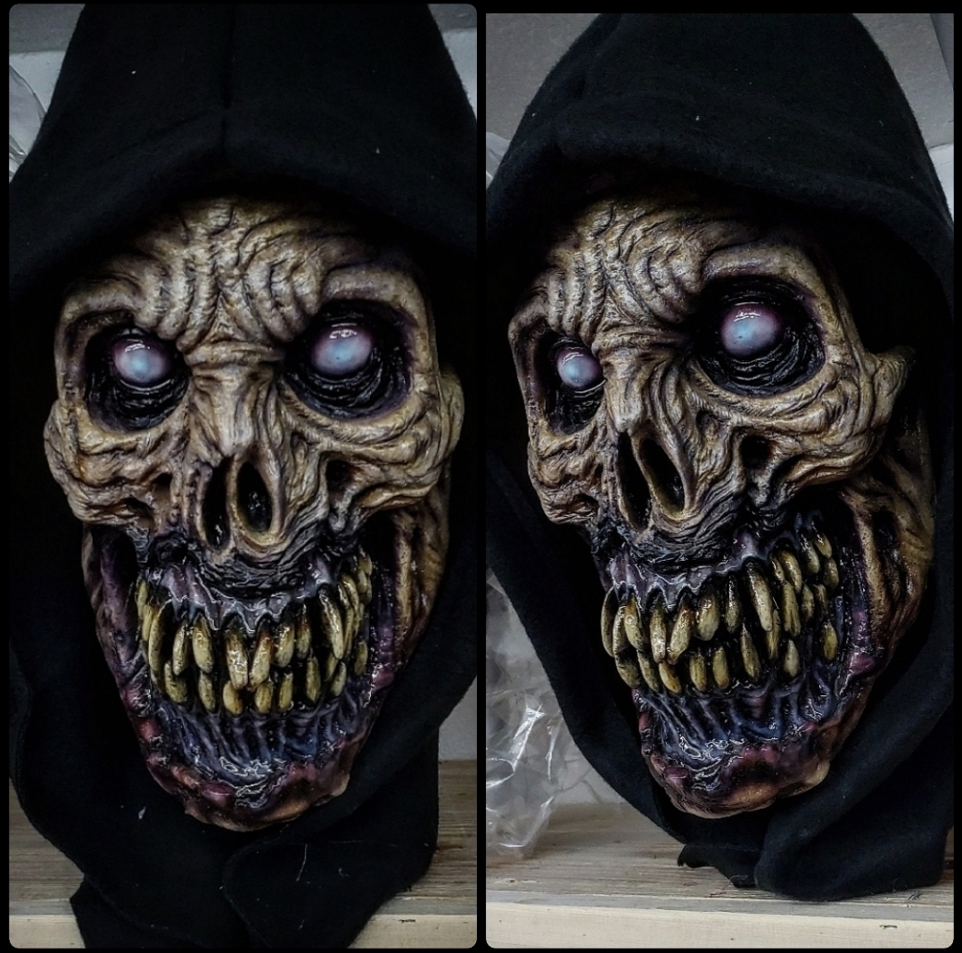 Getting into to her vehicle after a late night at the office, Anne Bettes notices something strange in her back seat through her rear view window.. Death. The Necrobutcher is available wearable or display.